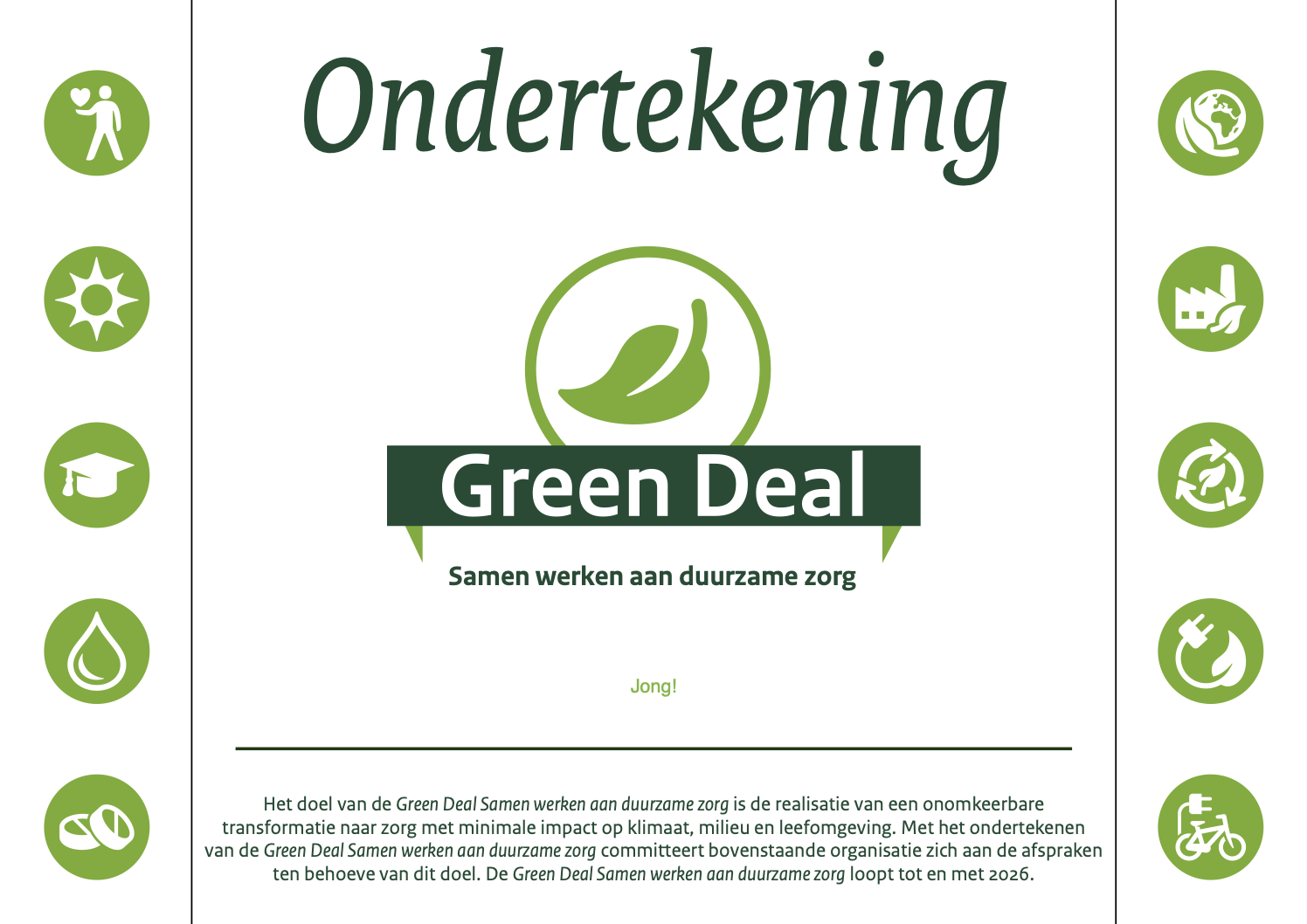 Jong Zorg onderstreept het belang van duurzaam ondernemen en heeft zich gecommitteerd aan de Green Deal 3.0. We hebben een oorkonde van ondertekening ontvangen, waarmee we duidelijk maken dat we met de Green Deal aan de slag gaan.
